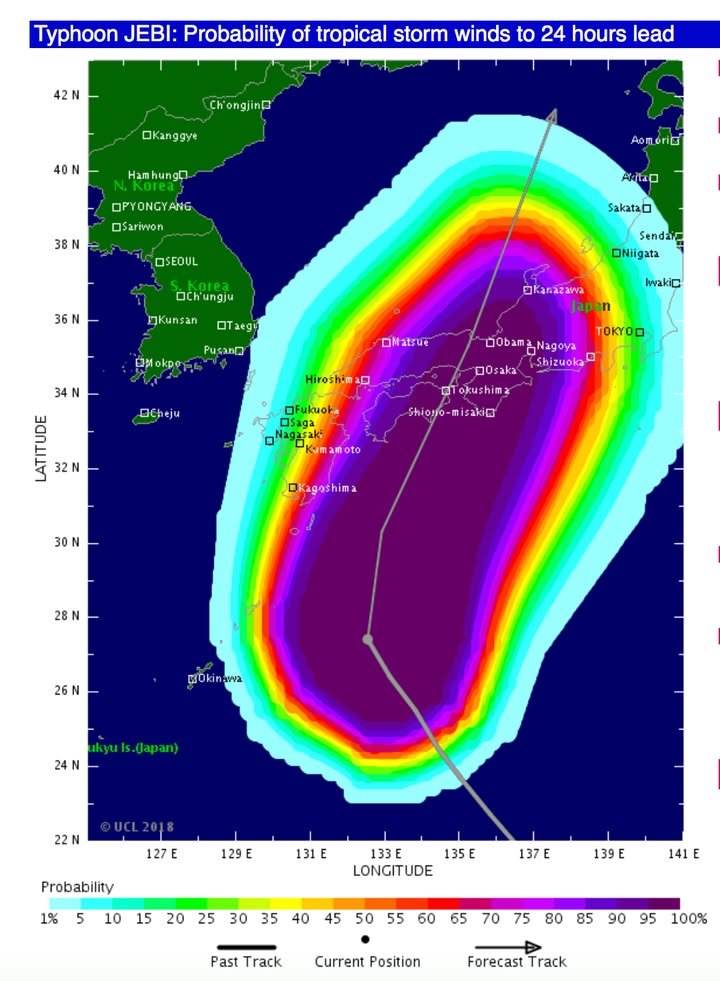 This image shows that Jebi (curiously cute name for a monstrous storm system!) is expected to miss Kumamoto by quite a bit. Even so, folks on the eastern side of the prefecture (Aso, etc.) have almost at 50/50 chance of experiencing tropical storm winds (63-118 kilometers per hour or 39-73 miles per hour).