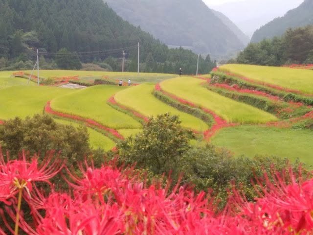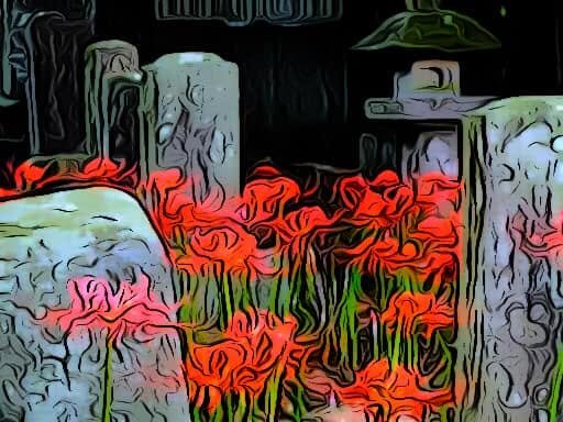 Their bulb and root systems are extensive, which is why they are often planted to stabilize aze dikes protecting rice paddies. This is also due to a unique feature: they flower before their leaves appear, which generally happens after the harvest. Their roots are also toxic to moles. If you have a camera, head out to the countryside for a splash of gorgeous autumn scarlet. Below is a photo of higanbana blooming on aze dikes in Yabe, and some growing amongst the graves on Hanaokayama. - William