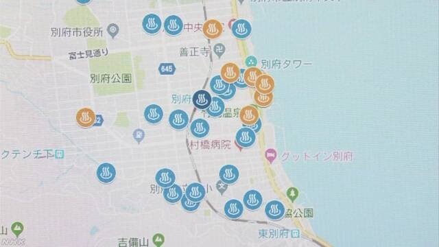 If you are considering going to OIta and you or someone who will be with has tattoos, I recommend that you check it out. According the the pie chart in the NHK report, 65.6% of the onsen (hot springs) in Beppu allow folks with tattoos to use the facilities. The third image is of a color coded map showing where different types of tattoo friendly facilities are located.