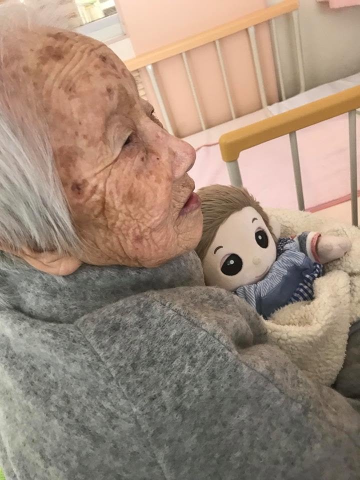 Now, she is a baachan at Meisuien. She saw another baachan with a doll and was quickly drawn to it. She was then given a similar one by a nurse, and has since not left it’s side. She brings it everywhere with her, sits it up and has conversations with it, has made a makeshift bed next to hers, sings it lullabies while rubbing the dolls back. When other baachans comment on how cute it is, Eiko-san will pat the dolls head and say, よかったね!She refuses any nurse that tries to take it away.
