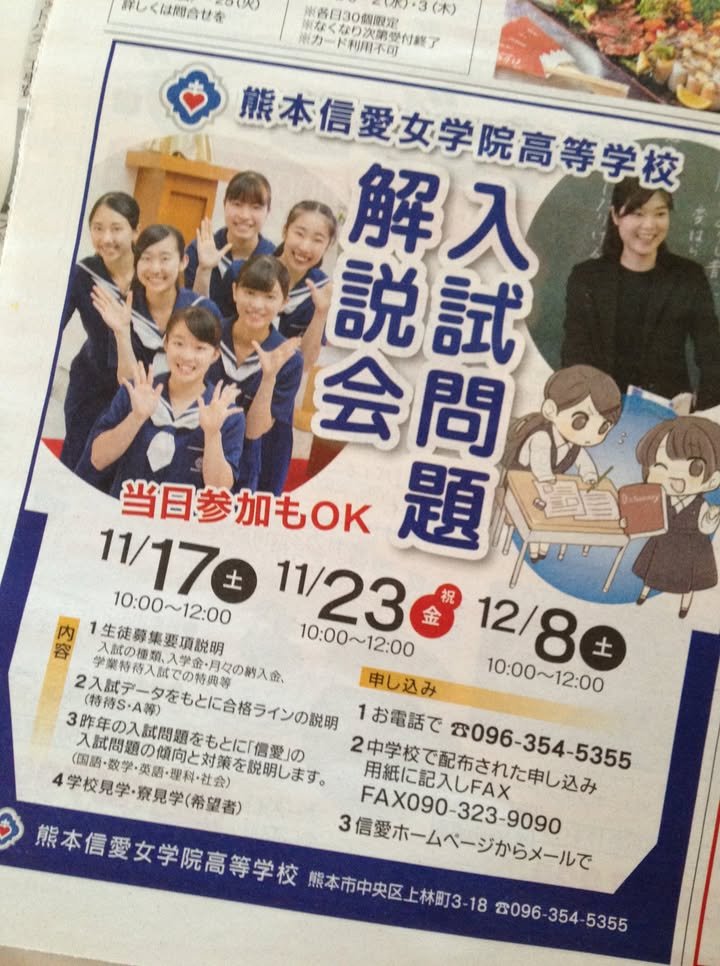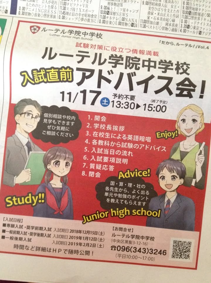 Hi there! JHS Info Sessions/Entrance Advice - Do you have kids heading into Junior High School in the near future? If my memory serves me right, about this time last year people were asking about JHS Open Days and info seminars in Kumamoto. Well, the free-sheets we got this past week have had such adverts - see images attached. I don’t know much about the schools in question, but hopefully this information can be useful to some of you with kids, especially those in upper primary - Ruth