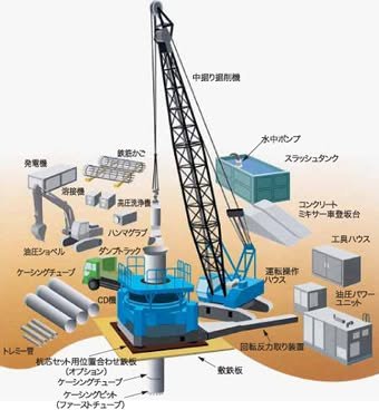 The young worker who kindly responded to my beckoning said 「チヤック」- “chuck” -and, noticing my confusion, gave me its more formal name: 「全周回転機」(ぜんしゅうかいてんき). A somewhat prolonged Google search provided it’s English translation: “casing rotator.” (It’s also called a “chuck” in English.) Basically, a huge pipe with teeth is lowered into a gigantic rotator to dig, and an immense crane drops a weight with a device at the tip that looks like a stork beak that snaps shut when it hits the bottom and is raised to empty its contents, and the process repeats. The casing will be left in place, filled with concrete, and - voila!- a foundation.