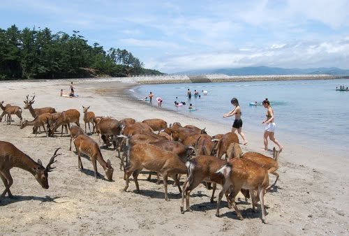 Technology will grow increasingly important in linking the elderly remaining in Japan’s depopulated hinterland to its burgeoning cities. Below: Deer on a beach in Akune (obviously). - William