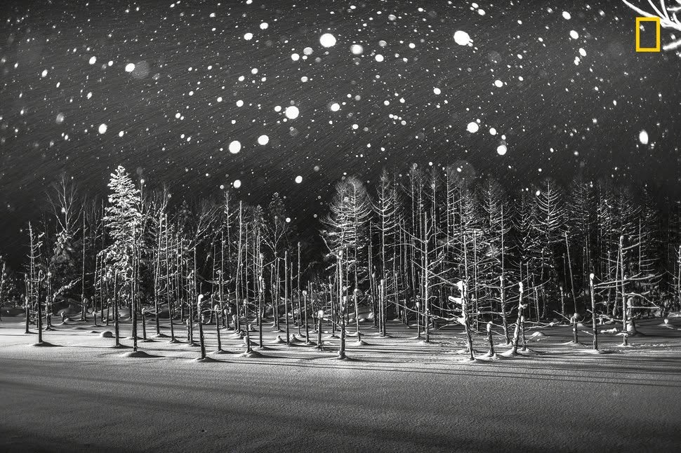 “Japan’s Blue Pond in Biei-cho, Hokkaido, has become very famous for attracting tourists from around the world. It is surrounded by beautiful mountains and trees. This pond, frozen during winter, was artificially made to prevent river contamination from the nearby active volcano, Mount Tokachi. The accumulated pond water contains high levels of minerals, such as those containing aluminum. The alluring view of the blue pond can take one’s breath away. To make this image, I made the exposure longer to capture the way the snow was falling. At the same time, I lit up the strobe for a moment to capture the snowflakes that are reflecting in the foreground. I took as many photos as I could and chose the one I thought had the best balance of the falling snow and the unfocused snowflakes. I wanted to express how time is created in just one moment and, by tying together these moments, history is made.”
