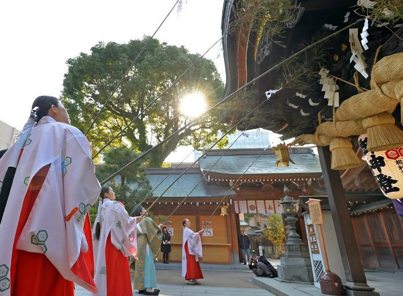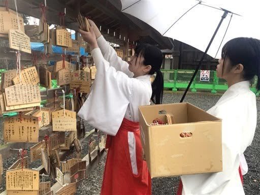 Shrines and temples at this time are ritually cleaned using a long stalk of young bamboo called “aodake” (青竹), and the “ema” (絵馬 - votive slabs of wood often featuring horses) are removed by miko, or shrine maidens (巫女) to be disposed of by fire. Kumanichi reports on such bustling activity at Aso Shrine. A senior priest (apparently one rank below chief priest and called a “negi” - 禰宜 - which is an awesome kanji) noted that full reconstruction of the shrine’s main two-storied gate (“roumon,” 楼門), a National Treasure destroyed in the quakes, is expected to commence early in 2019, so if you want to view what remains of current ruins, now is your last chance. - William