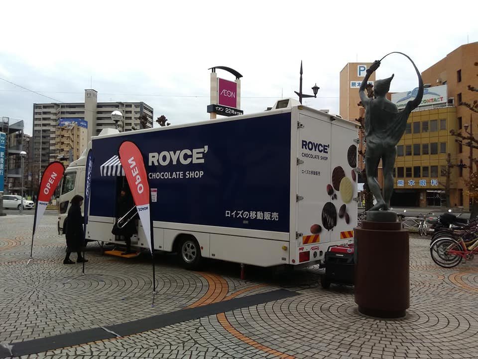 Breaking news from your roving chocolate correspondent! If you’re a chocolate lover, and forgiving of unnecessary punctuation, the Royce’ chocolate truck is in town. Parked outside the Oe Aeon/United Cinema on Densha-dori until January 14th, you can stock up on goodies for your winter kotatsu life, or get ahead of the game and make all your Valentine’s Day purchases. I intended to do the latter, but who am I kidding, these are all for me really. I always have a moment of panic when I’m asked if I need extra gift bags, as if the clerk can somehow read my mind. If you haven’t tried them, I recommend the Mild Bitter Royce’ potato chip chocolates, a delicious combination of sweet and salty. That punctuation mark really bothers me though…