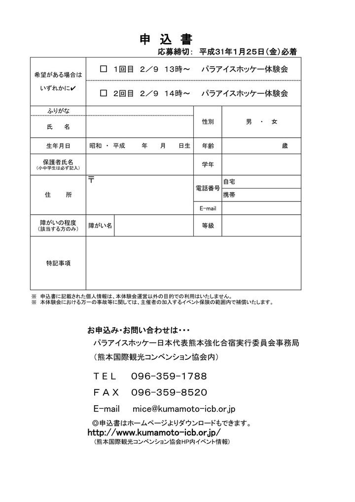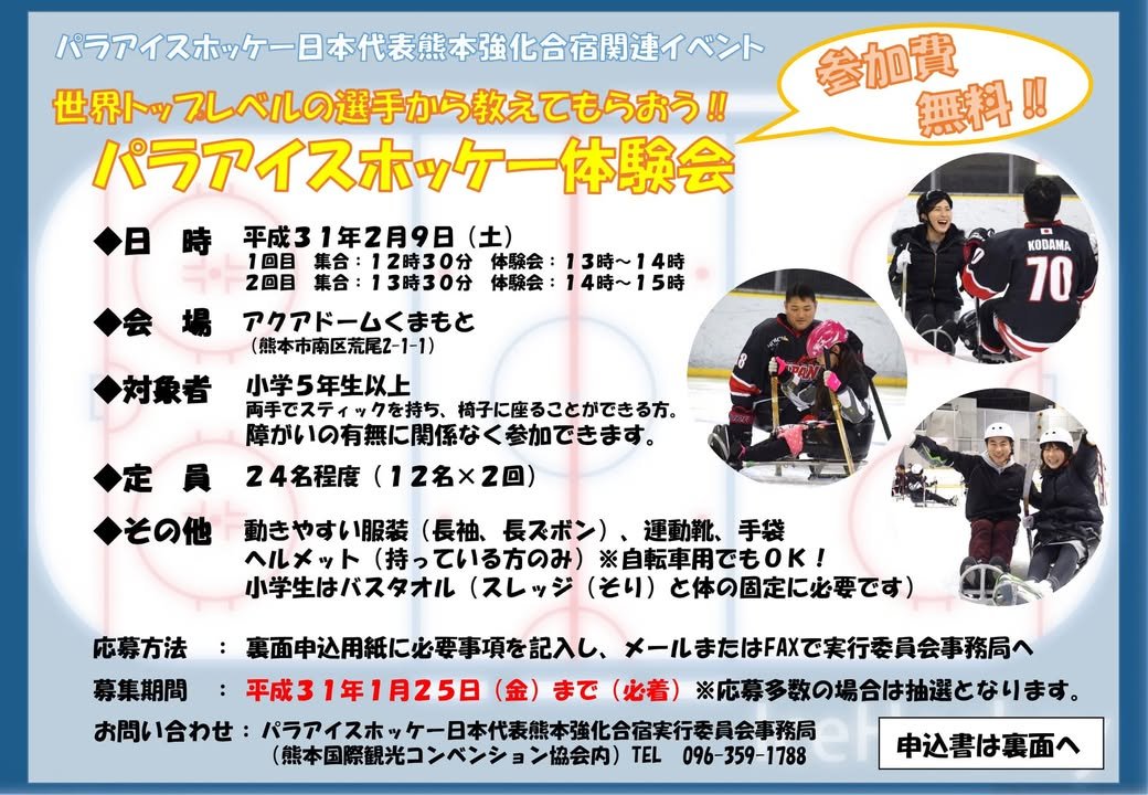 Joe Tomei here, with an offer of fun on ice!! The Japan Paralympic Ice Hockey team will be at AquaDome (http://kc-sks.com/aqua/) in Minami Kumamoto on Feb 8-10 preparing for the A-pool matches in the world championship, to be held in the Czech Republic. What’s more, on the 9th, anyone over 5th grade elementary school can come and give paralympic ice hockey a try. There are two 1 hour sessions -checkin at 12:30 go from 13:00-14:00 -checkin at 13:30 go from 14:00-15:00 There are 12 spaces in each trial time, so if you or your kids want to give it a try, please fill out the the form below. (sign up deadline is 25 Jan)