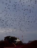 According to Shimizu Mimoru, horticulturist at the botanical gardens adjoining Ninomaru Park, an impressive murder of crows has been appearing each evening. There is nothing unusual about this, he says, especially in mid-winter when crows leave the mountains; crows murder in the evening before flying off to a communal roosting spot, presumably to hatch their next murder. If you would like to photograph the castle surrounded by a murder, early dusk is best. - William