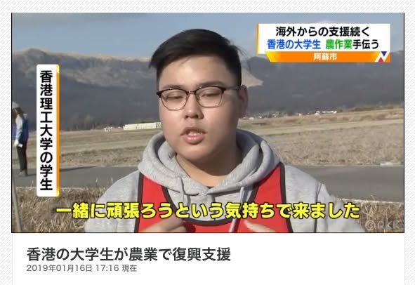 Though more than two years have passed since the 2016 Kumamoto earthquake, many people are still feeling its impact. This news story is about students from The Hong Kong Polytechnic University who came to the Aso area to help a farmer still recovering from the quake. Hats off to the folks at Hong Kong Polytechnic for continuing to offer help after so many people outside of Japan have forgotten about the quakes.