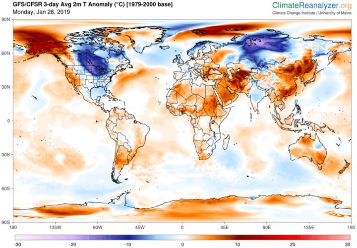 The image below shows global temperatures relative to the past four decades for this time. The warm winter we're enjoying explains why plums are blossoming so early here and why now is not a good time to visit North America. (Though my California surfing friends tell me the water is toasty and the air balmy.) - William