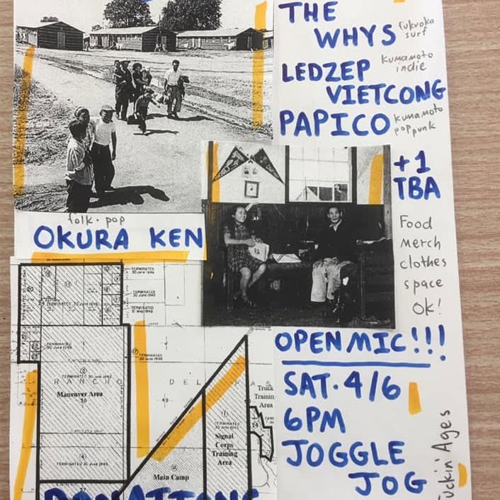 The next Gumby core event will be held at Jogglejog in Kawaramachi. The plan is to add bands with an open mic. I also wanna have some tables outside where folks can sell or give away stuff. The show will resemble more of an American house show atmosphere rather than a live house feel. It’s all ages and donations are accepted. John Jay Onyskin