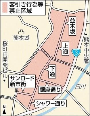 But some dubious activities do occur, mostly involving touts (kyakuhiki, 客引き) who lure generally previously inebriated customers into dens of ill repute - known as fuyoku (風俗)- entertainment and amusement trades such as bars, restaurants, mah‐jong parlors - and fleece them. Kumanichi reports that a new prefectural ordinance has begun which prohibits such activity in the 繁華街 area, though distribution of flyers and tissue is still allowed - Good thing: I like free tissue. - William