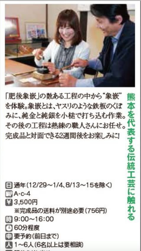 The attached image is one item from that e-book. It’s an opportunity to make your own Higo Zogan (silver or gold inlay, damascene) under the guidance of an expert craftsman. If you don’t know about Higo Zogan, check out the following page: