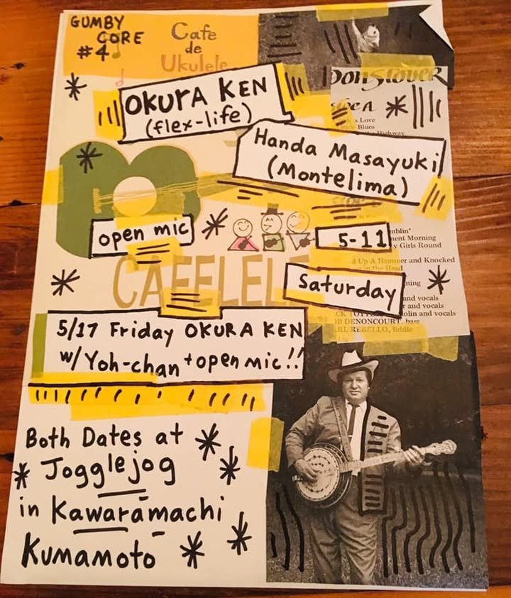 Kawaramachi is stepping up it’s game(sorta). The space above Out of Step Cafe will have an event on June 1st.That place is called Helping Hand Cats(sorta). That event looks like a mixture of jazz and indie folk/pop.Tonite at Jogglejog we have a free show with Okura Ken and Handa Masayuki. Both of these dudes play some good folk/pop and rock. After their individual sets they will do a Beatles set. Okura Ken also teaches Ukulele once a month at Out of Step. It’s about 2500 yen for an hour of instruction with a drink and treat from Out of Step. If you don’t a have a Ukulele. I can provide a tenor or a soprano Ukulele free of charge for you to join the lesson. Jay Onyskin