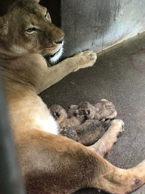 San is a 10-year old lion. Kuriya is a 5-year old lioness. They live at Kumamoto Zoo and apparently have become smitten as they have produced three cubs. The cubs have not been sexed yet because the mother would maul to bits any volunteer who would volunteer to sex them. They will be sequestered until weaned; only then will we know.