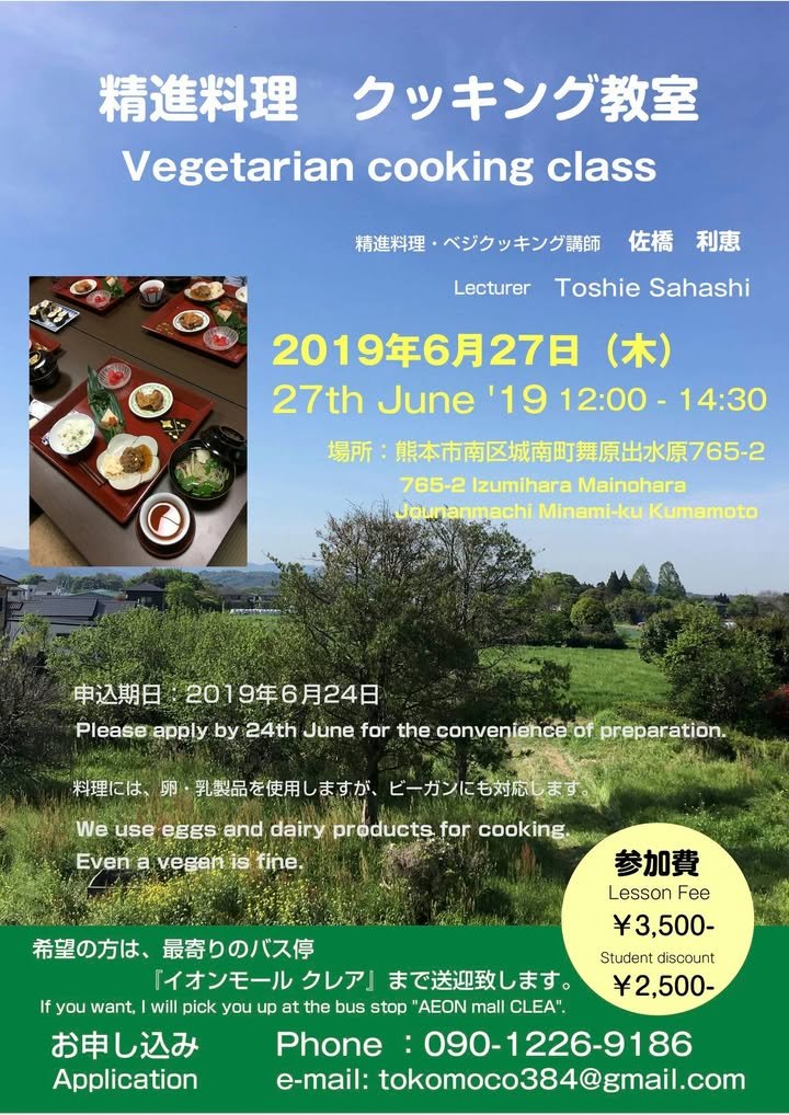 If you’re vegan, the Japanese text in the announcement indicates that, while the shoji ryori taught in this class normally uses eggs and dairy products, the teacher is willing and able to adjust the ingredients to accommodate vegans. If you’d like to participate, please send an e-mail to the address listed on the flier.