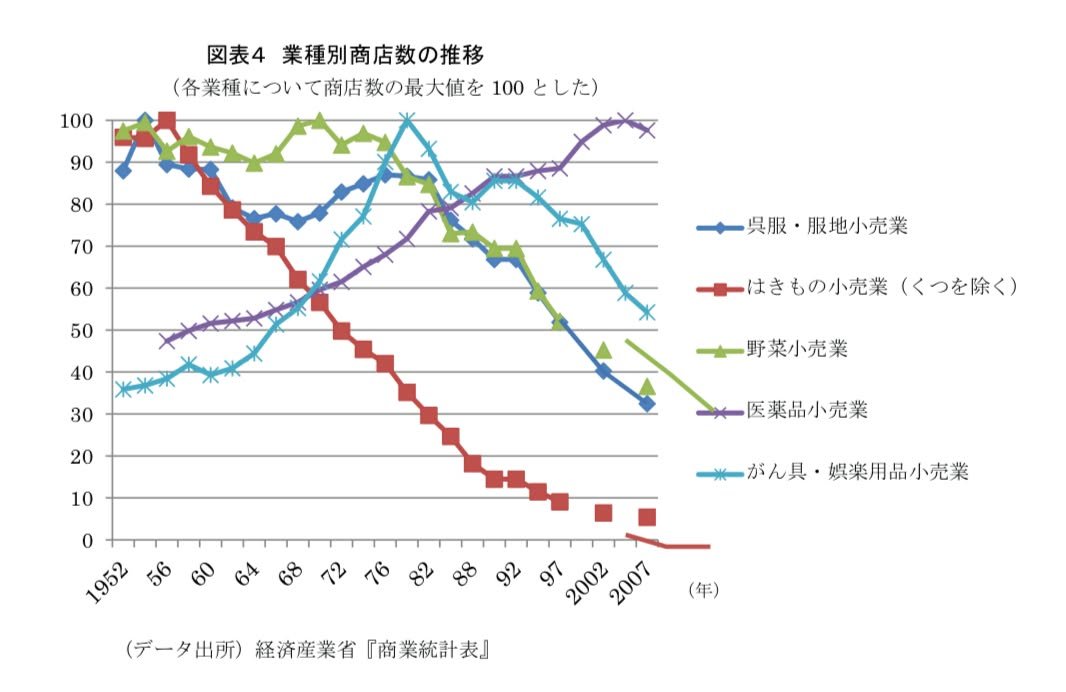 Yesterday, William posted about yaoya (vegetable shops). I share his affection for them but, unfortunately, their numbers are in decline. In the following graph, numbers of several types of stores are show relative to their peaks (for each category, the peak number is 100 and all other values are relative to that). The greatest decline has been in shoe stores (red) but vegetable shops (light green) have declined quite a lot too. As people still need to eat and, presumedly, are eating about the same amount of vegetables, this means that more people are buying their veggies at large-scale supermarkets.