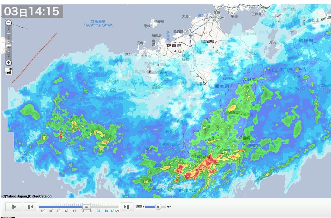 My corner of Kumamoto City is surprisingly quiet now (not much rain). I seem to be in a pocket of white in the radar image you see below. The nastier colors (green, yellow and red) are likely to come this way from the west, however, so it ain’t over ’till it’s over, so to speak. I think that’s probably why my university (Kumamoto Gakuen University) and Kumamoto University (and perhaps others – I haven’t checked) have canceled classes this afternoon.
