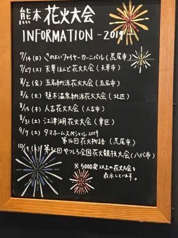 Also, Joe Tomei here again, and this picture is from Jackie Bencke, who saw it at the Hamasen Starbucks and passed it on. It’s a listing of all the fireworks displays in Kumamoto prefecture. I put it up without translation cause I think it is simply enough to figure out. For details of each event, you can go to https://hanabi.walkerplus.com/list/ar1043/ (This is the link for the Kumamoto prefecture list) which gives details of all the fireworks displays in Japan. If you’ve not attended a fireworks festival, people generally go early and it’s a bit crowded getting back, but that’s part of the Japanese experience, I suppose.
