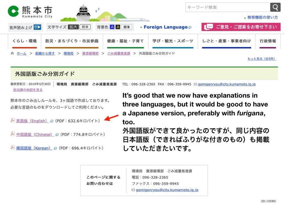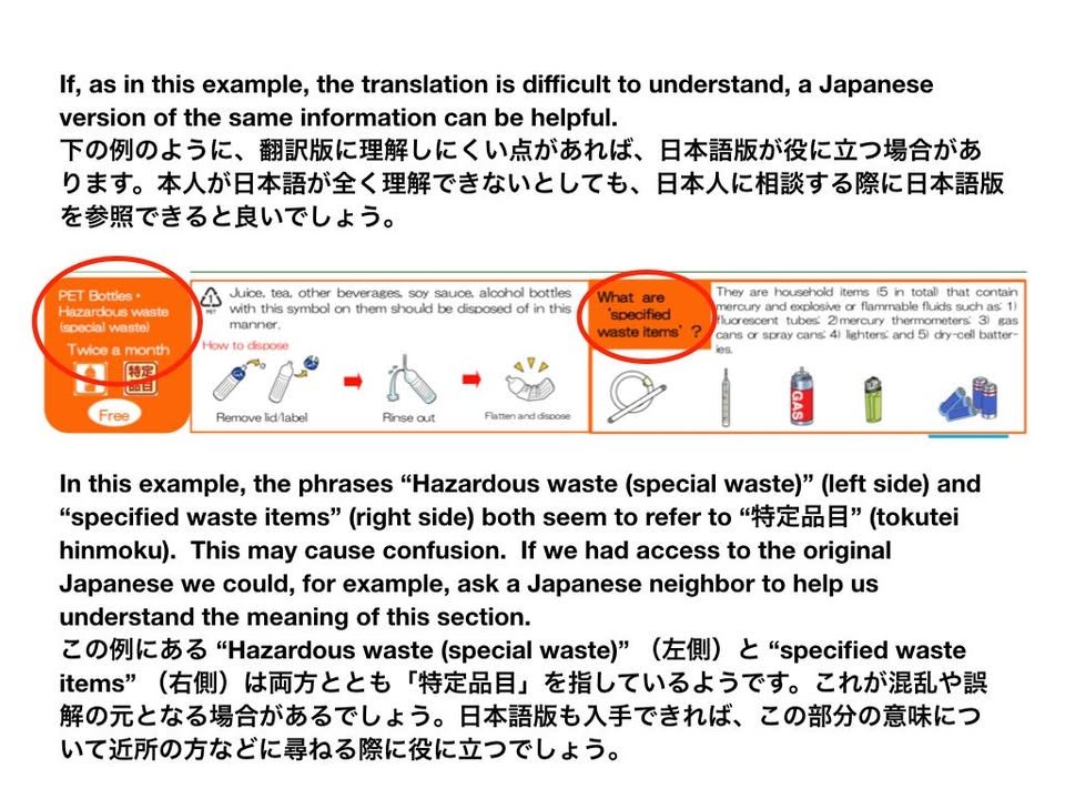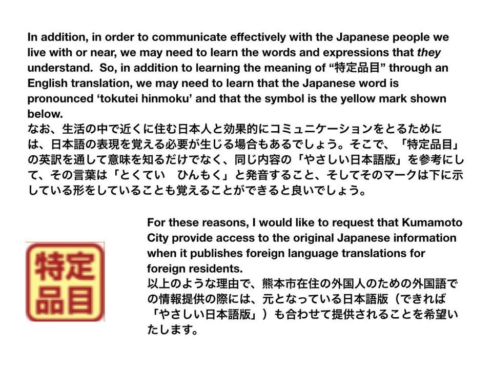 I think the City’s publication of this information in English, Chinese, and Korean is a very positive step forward. It would have been even better, however, if they had published a Japanese version, preferable a “simple” Japanese version (furigana added, simple phrases added to improve clarity for non-native readers, etc.), with the foreign-language versions. Here are some reasons why I think it’s a good idea to publish Japanese versions with translations.