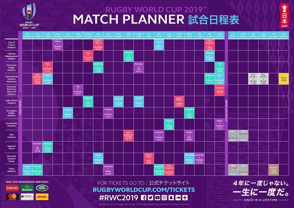 This shows the schedule for rugby games in Kumamoto. As you can see, games will be played here on the 6th and 13th of October.