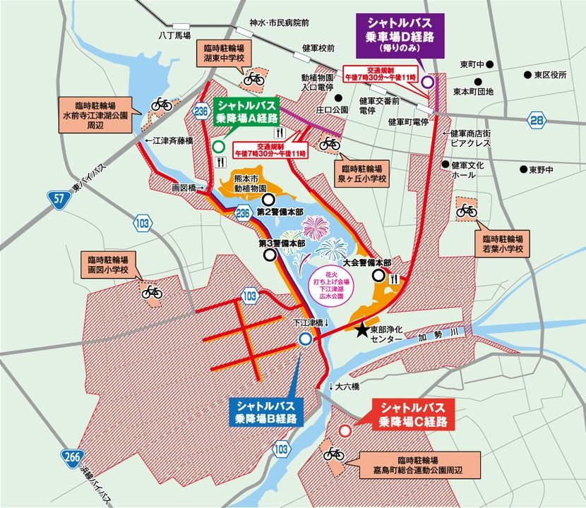 Yesterday, Atsuko shared a nice map that provides information about the fireworks on the 31st. Here’s another, very similar map. I’m posting it in addition to what Atsuko posted because it shows where you can park you bicycles. Also, note that roads in the shaded areas will be closed to bicycles as well as cars. So, if you’re a cyclist, you’ll need to figure out where you want to park you bike: