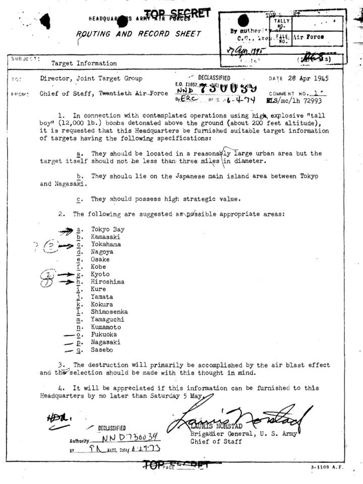 Now that several weeks have passed since the anniversary of the bombing of Nagasaki it’s a bit late but I thought I’d share some evidence I came across that Kumamoto had been one of the candidate targets for a nuclear weapon. I found the link to this document on the following page: