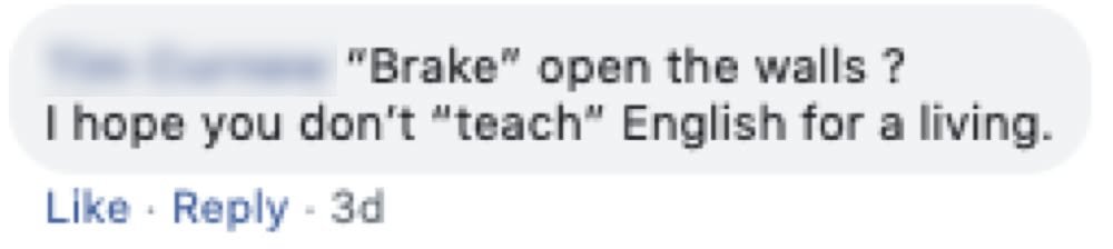Kirk here. I recently got the feedback you see in the image about a stupid mistake I made in a post. I wrote “brake” when I should have written “break.” I must admit that I do this sort of thing far more often than I should – not only on this page but in other contexts as well. No one is perfect but I seem to have a particularly strong tendency to make such errors. So, my initial reaction was “Oh no. I did it again. Well, it’s good that he told me about it so that I can fix it.” Then, the import of the second sentence sunk in. Basically, I was being told that because I have a tendency to make such errors, I’m not qualified to teach English – an ad hominem attack. In other words, unlike the first sentence, the second sentence placed the focus on me and what I am or am not qualified to do, not on what I wrote.