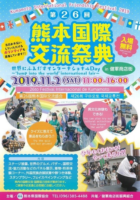 Hello! The 26th Kumamoto International Friendship Festival - 「~世界へふみだすインターナショナルDay~ ‘Jump into the world’ international fair」will be held on Sat, Nov. 2nd・11月2日(土) from 11am-4pm at Kengun Shopping Arcade・健軍商店街 🎶🇿🇦🏴🎤🎻🇨🇦🇧🇷🍀 Volunteers are always needed so if you’re interested in helping out, please check the information in the link: http://www.kuma-koku.jp/page60.html?type=top 🥙🥨🧠🌍⛳️👳♂️💃🥟🍛It’s always a fun, informative event, so drop by for the stamp rally, food stalls, dance and music performances, and the costume and culture information booths - Ruth