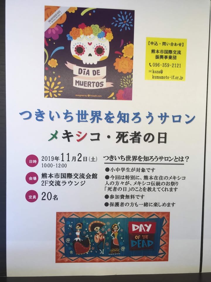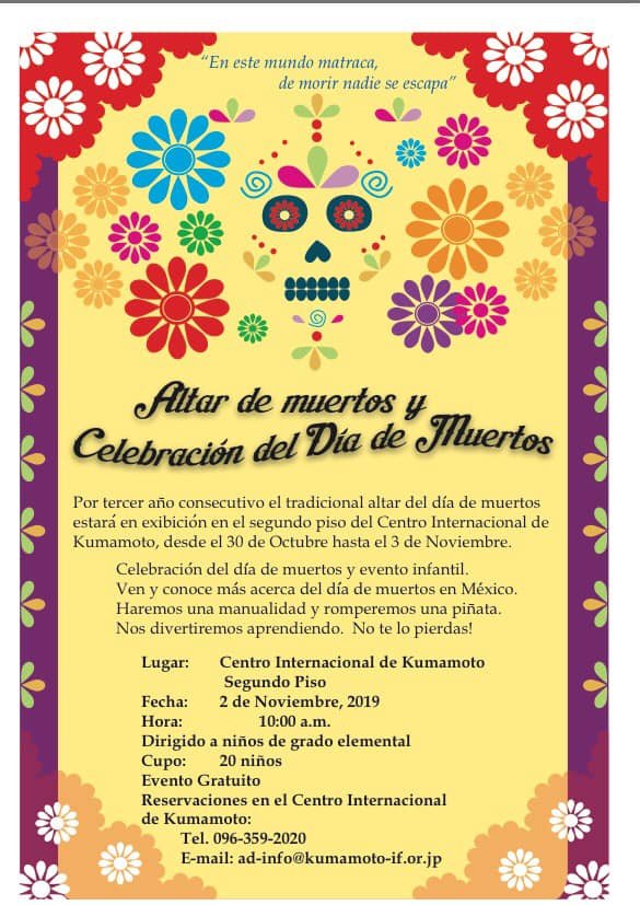The holiday is particularly focused on children, who make and munch alfeñique, which is a confection molded from sugar paste in the shape of a human skull (yes, it is an acquired taste - a symbol of the finiteness of life akin to the sugar lotus flowers displayed during Obon - but I grew up with them in LA). Our friend Luz-san is the matriarch of the Kumamoto Mexican community. She has organized an event at the International Center for children to be held on Saturday, Nov. 2nd, from 10:00 AM. Admission is free, but the number is limited to 20 children, and a reservation is required, available at the number or email on the link. Thank you, Luz-san, for your everlasting efforts to promote international understanding. - William