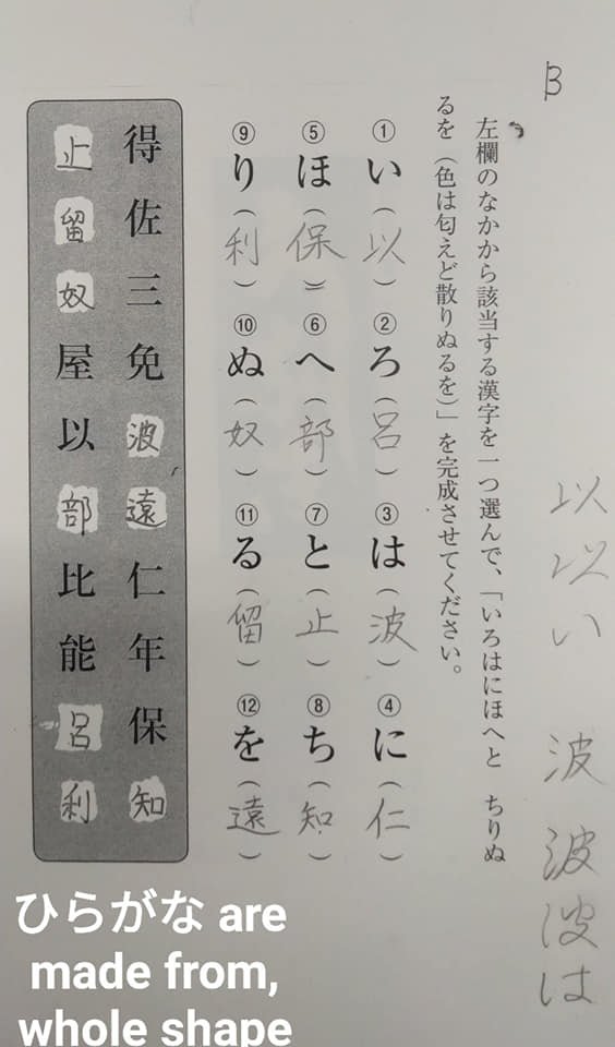 Japanese 仮名(かな KANA)is made from, made of 漢字(かんじ KANJI). ひらがな(HIRAGANA)is made from whole KANJI shape. For example, 「い is made from 以.The whole shape and sound are same.」