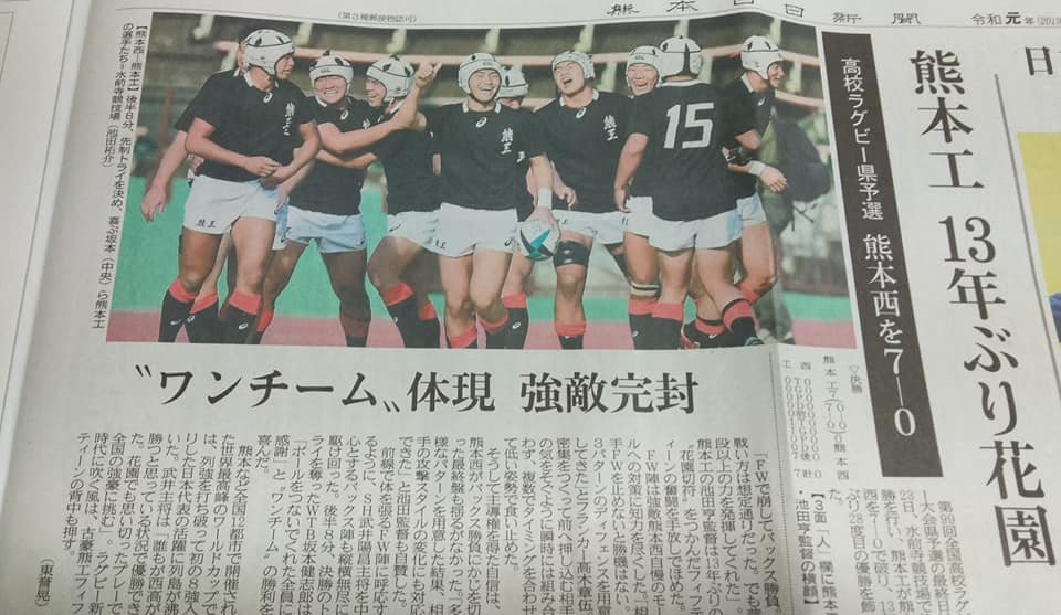 Hi friends. You might become a big fan of rugby because of rugby world cup.Yesterday, there was rugby Championship of high school in Kumamoto. Unfortunately my kids’ high school couldn’t win it. (西高Nishi Kou was last year’s winner) But it was nice game. Congratulations!! 熊工Kuma Kou!! (BTW 西高’s 高kou means 高校high school’s 高high. 熊工’s 工kou means 工業industry, technology, yes, their school is technological high school.😉)