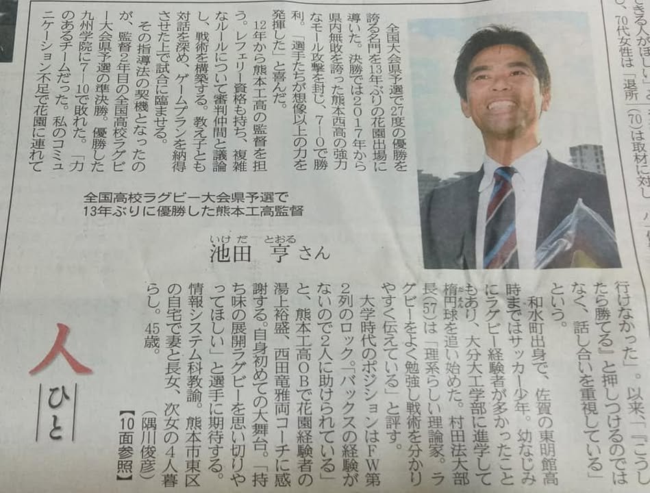 Addition, the head coach, Toru Ikeda is my junior high school days good friend!! He is really nice guy. Please support, root for them, KUMAKOU at High school rugby Championship all Japan in January!!ーAtsuko(Ü)