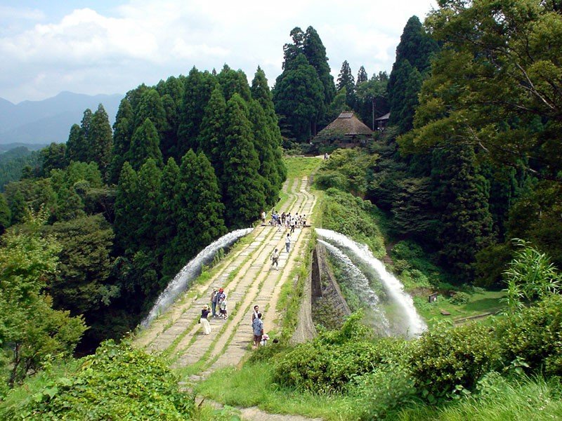 A charm of Yabe (now Yamato-cho) is its vast network of irrigation built over centuries to deliver water to its terraced paddies. A challenge was Shiraito Plateau, which was cut off from any waterway by deep ravines, so in 1854 Tsujyunkyo (通潤橋) was built both as a bridge and an aqueduct. Water passes from a canal on the north through three channels embedded in the bridge, driven by a slightly higher elevation on the northern inlet compared to the southern outlet. A problem of sediment buildup in the channels inspired a creative solution: drainage holes at the lowest point in the center of the bridge, plugged by wooden stoppers which are occasionally removed to flush the channels.