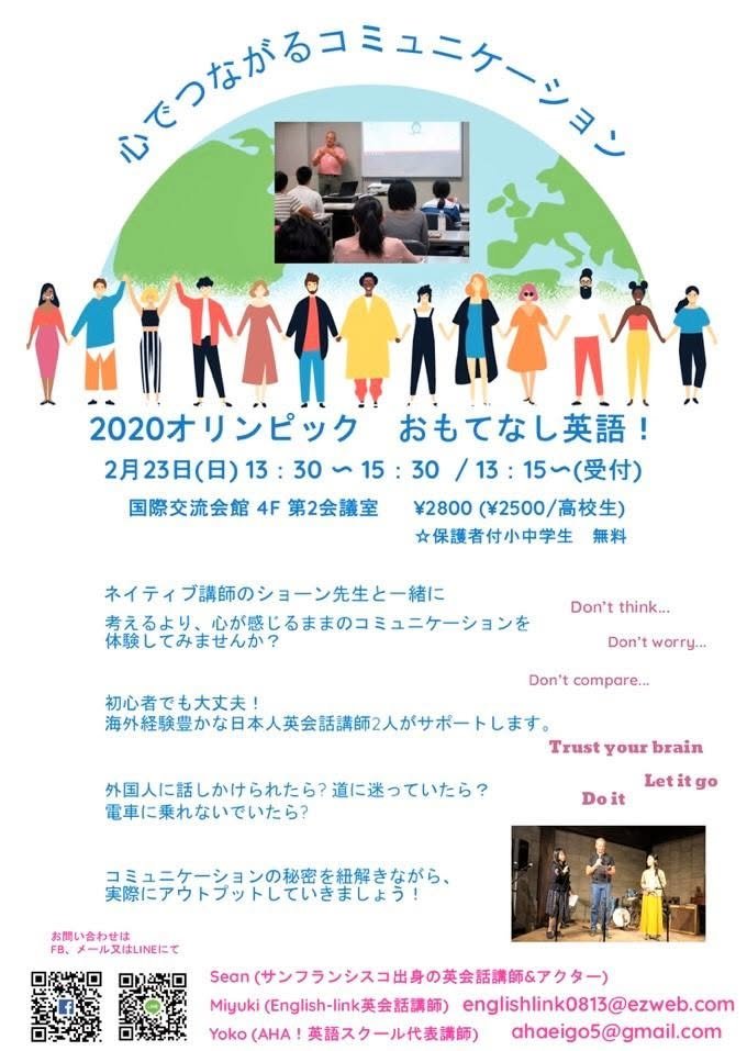 Our friend Sean Benward along with some very talented Japanese English teachers will be hosting a seminar at the International Center on 2/23 from 1:30 - 3:30 designed to encourage speaking English without worrying about mistakes but rather to learn the enjoyment of communication. The topic this time will be the Tokyo Olympic Games. The seminar is aimed at both adults and primary students. Information is at the link. - William