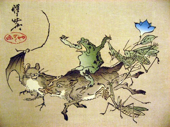 Of course, they often featured in Yokai woodprints. I have no idea why this bat seems to be whipping two animals that have no business flying, but there must be a story behind it somewhere. - William