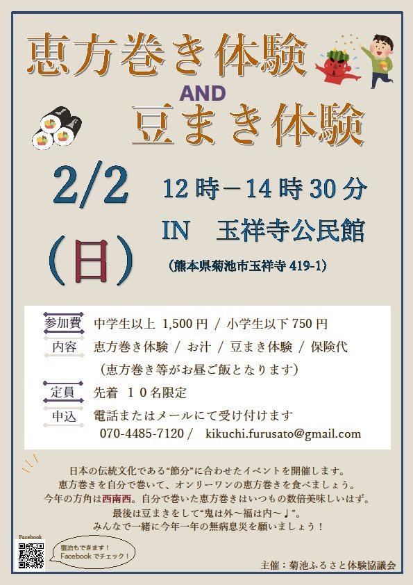 How about trying Mamemaki and making Ehomaki in Kikuchi this weekend for free?