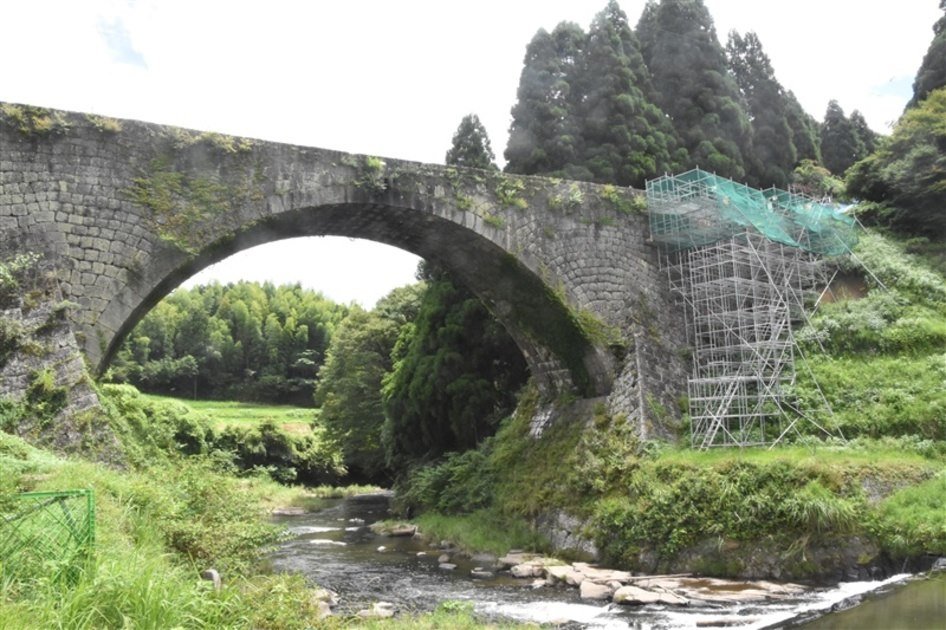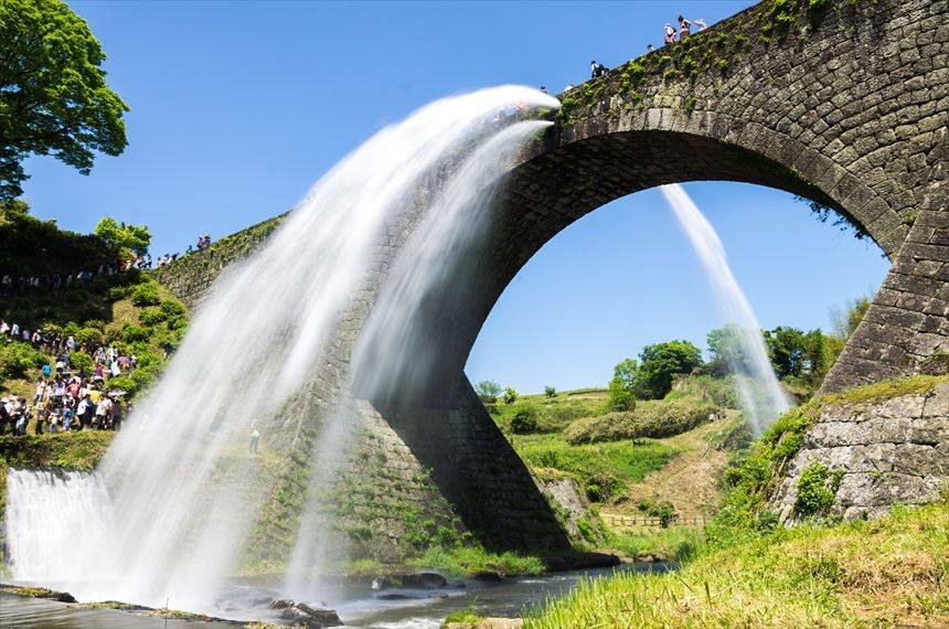 Tsūjun Bridge (通潤橋) is an arch bridge completed in 1854 and is the largest stone aqueduct in Japan, built to transfer water to an isolated plateau in the Yabe area. It is a symbol of Kumamoto. The builders used a sagging method, with each end higher than the center, to save on material cost. The problem was that sediment built up in the center, so sluice openings at its lowest point were installed to periodically flush the aqueduct.