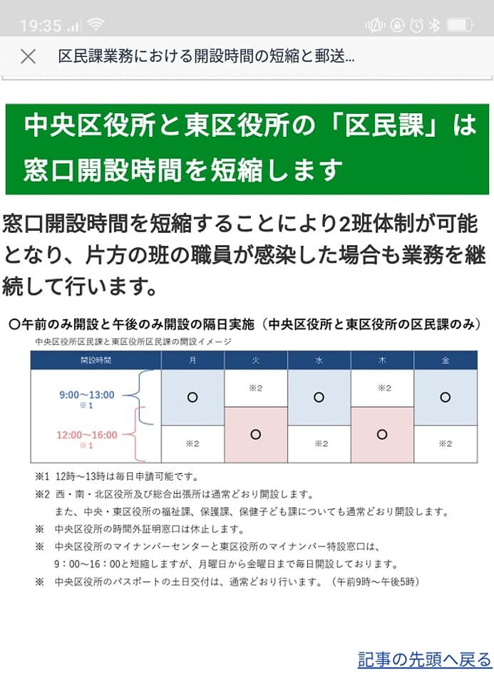Hi Sorry for late updating. Kumamoto city office says they open Ward office of Tyuou- ku and Higashi-ku only limited time. They open the inquiry counter from 9am to 1pm on Monday, Wednesday, Friday. On Tuesday and Thursday, they open it from noon to 4pm. It’s cause of COVID-19, yes, not to crowded. At West and North and South Ward office open as usual. They recommend you to ask to get your documents by mail. Sorry, I’m so busy now. I should go to meet my young daughter who stay at my mother’s house to escape from COVID in Nagomi town, my home town.