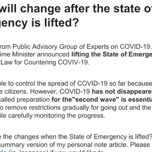 Joe Tomei here. This is an English translation of the Japanese information located at https://note.stopcovid19.jp/n/n203b653b4345 What will change after the state of emergency is lifted?