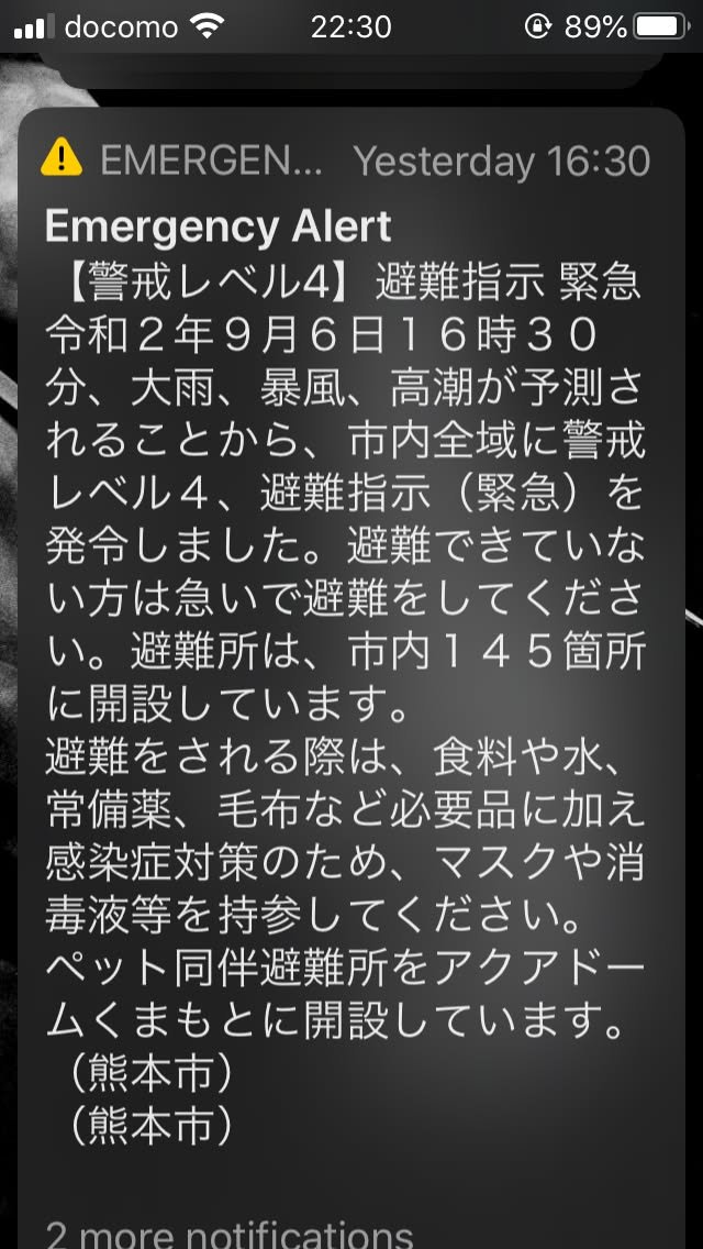 I got the following emergency text message on my phone but, on my iPhone at least, it’s not possible to select the text and then paste it in to Google translate. With over 40 years of experience studying and using Japanese, that’s not a problem for this old codger, but it strikes me as rather problematic if that is what everyone is getting, regardless of their linguistic preferences.