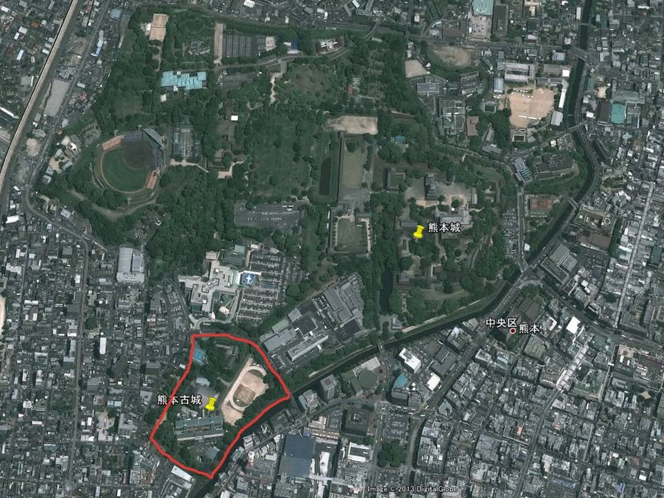 Most who envision Kumamoto Castle summon up the massive donjon topping Chausuyama (茶臼山), part of a string of volcanic mounts which stretch from Unzen to Aso, and Kato Kiyomasa, the first Edo lord of Kumamoto who built it. In fact, he was adding on to a more ancient structure known as Chibajyo (千葉城), built by the then-dominant Kikuchi clan, in around 1485. The name survives in Chibajyo Machi, the area around the NHK studio, though the castle itself was built on the opposite side of the current structure, much of it having been absorbed by Daiichi High School. (Disclaimer: both my children were born across a narrow street at Fukuda Hospital.) A long, narrow park exists in what used to be the moat, but plans are to restore this to its former glory. I love the quite ancientness of this forgotten corner and highly recommend a visit. Take the streetcar to Senbabashi(洗馬橋), the stop just in front of the post office, and happy wandering. - William