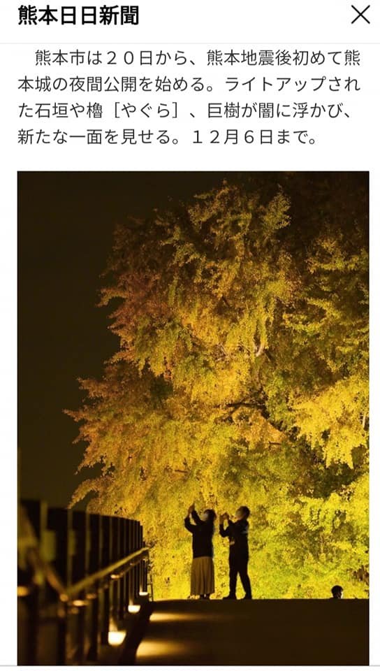 Hi friends. From today, 20th November to 6th December, Kumamoto castle will be illuminated from 5pm. The lighting-up is the first time after Kumamoto earthquake. Hoping you enjoy beautiful Autumn and Winter Kumamoto.ーAtsuko(ˊ˘ˋ)♡