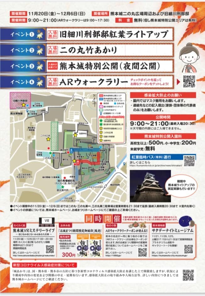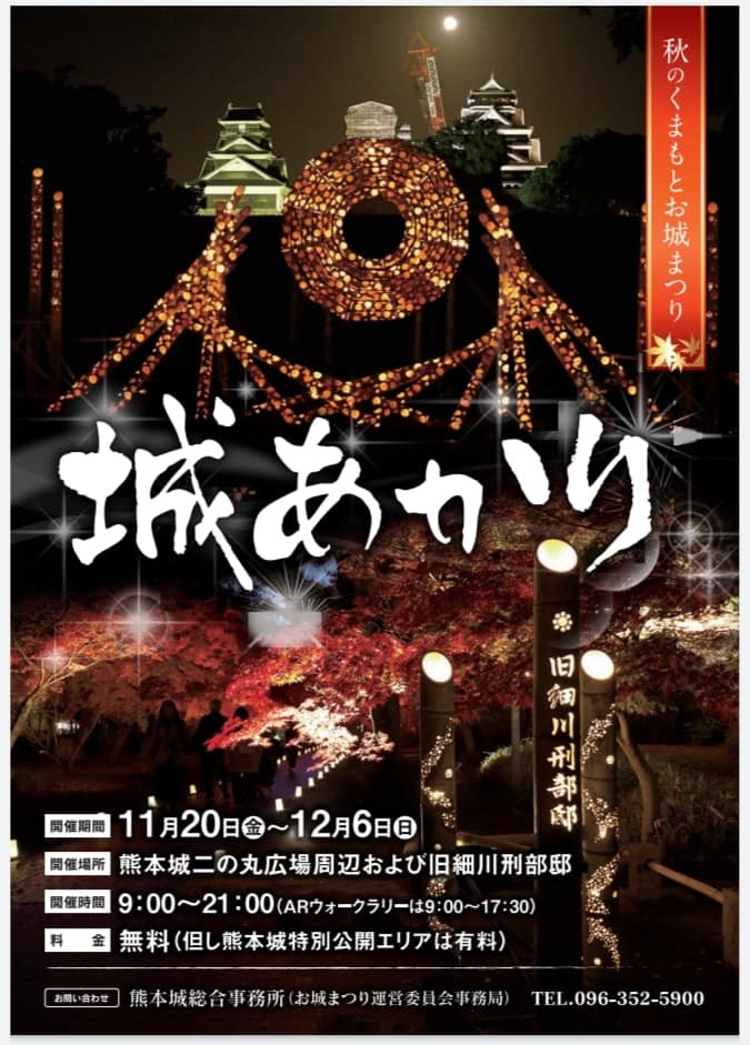 Hi again. I would like to add some more information about my previous post.(I couldn’t add these pictures once I posted.) During Kumamoto castle illuminated, 城あかり, 竹あかりTAKEAKARI, bamboo illumination is held around 二の丸 NINOMARU also. Last year, I joined the TAKEAKARI festival as a volunteer. This year, it seems to be held only around Kumamoto castle not around the streets. It’s so pity but it’s good we can enjoy the beautiful view. You don’t need to pay around NINOMARU and Hosokawa Gyobutei, I’ve posted beautiful Ginkyo tree before. The written entrance fee is only around Kumamoto castle area. Enjoy Minimum but MaximumーAtsuko(๑˃ᴗ˂)و♡