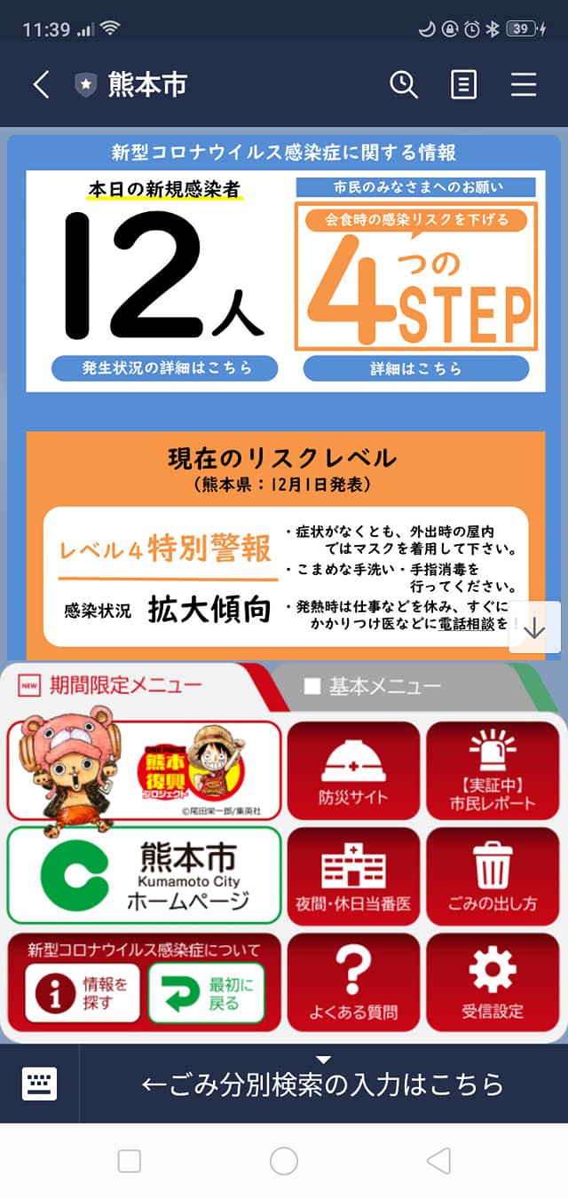 Hello friends. It’s cold but good weather today. Corona patients seem to increase these days. I always get information by Kumamoto LINE. It’s useful because they tell information automatically everyday. It is written in Japanese but has lots useful information. You can know the details by Kumamoto city HP also linked. Please, Be safe, be healthy, and Enjoy Special month MaximumーAtsuko(Ü)