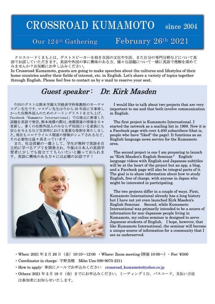Hi! Kirk here with a bit of self-promotion. I’ve been asked to talk about this forum by “CROSSROAD KUMAMOTO,” as explained in the attached image. The event will be online and anyone interested is encouraged to participate. Also, please feel free to share this with anyone who might either be interested in participating in this particular event or who might like to join the CROSSROAD KUMAMOTO group.