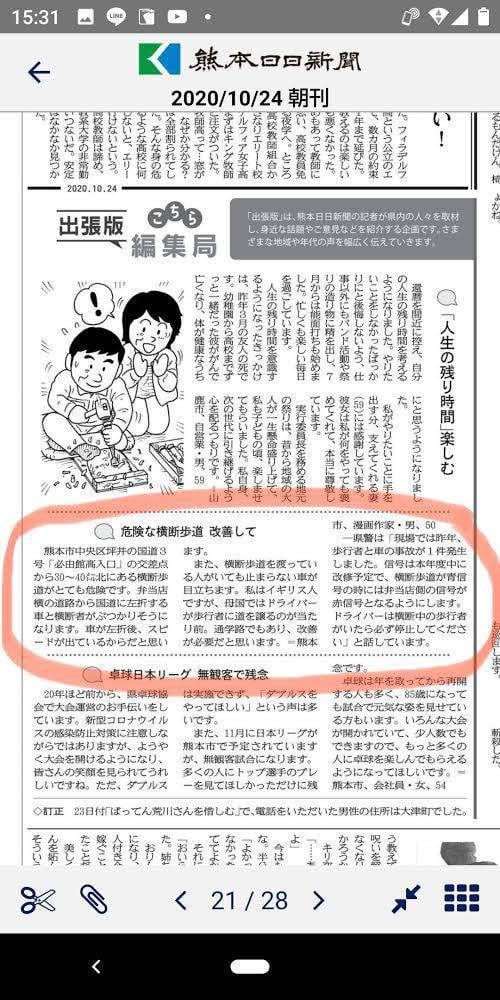 Sean is writing about the tendency many drivers in Kumamoto have to ignore crosswalks. According to Japanese law, drivers are required to yield when a pedestrian is standing at a crosswalk. Unfortunately, however, many don’t. Sean mentions a particularly dangerous intersection in front of Hitsuyukan High School. The newspaper editor follows up with a report from the police confirming that a pedestrian was recently struck by a car there and confirming that, yes, drivers are supposed to stop if a pedestrian is attempting to cross the street at a properly marked crosswalk.