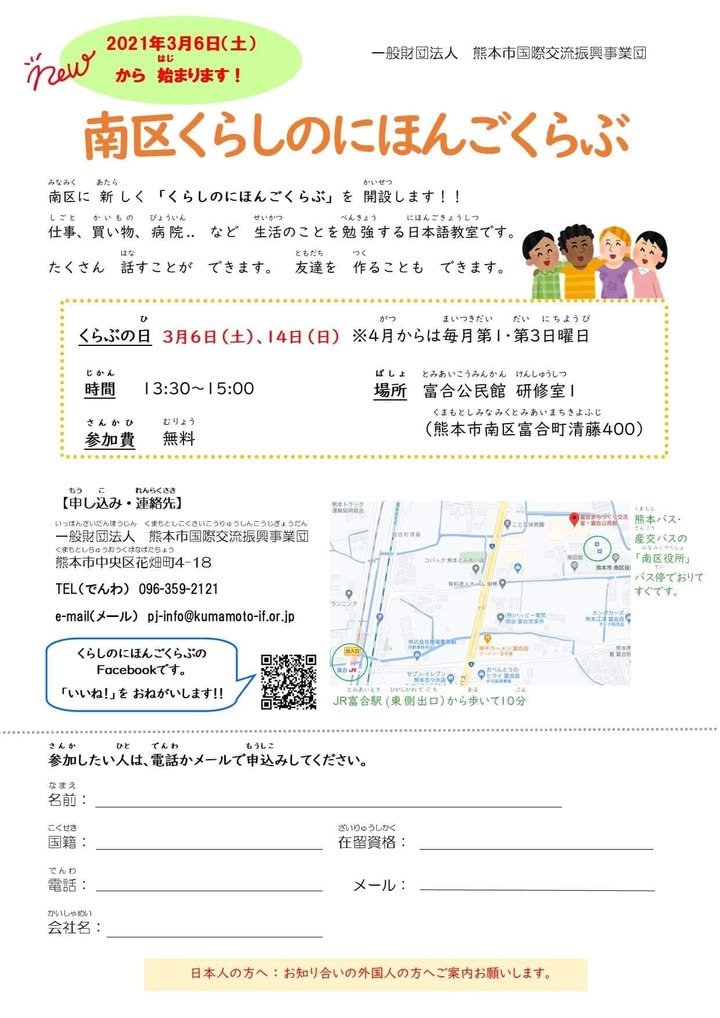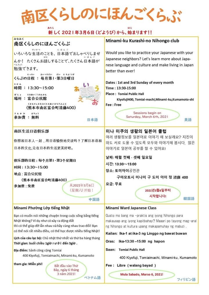 If you are living in the Minami-ward of Kumamoto City, this event might be of interest to you. Kumamoto International Foundation (KIF) is going to start “Minami-ku Kurashi-no Nihongo Club” from this month. March 6 (Sat.), March (Sun) From April, 1st and 3rd Sunday of every month https://www.kumamoto-if.or.jp/kiji003574/index.html