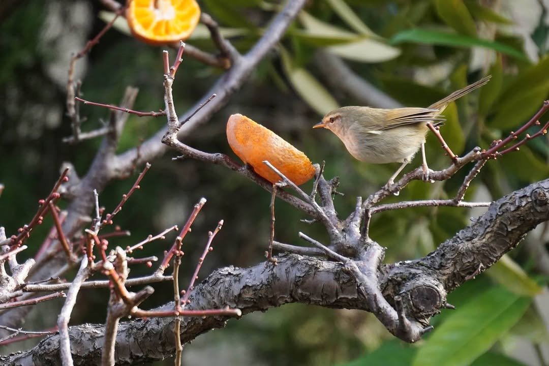 “Nightingale” in Japanese is ウグイス, but you’ll better impress your friends if you memorize the kanji, 鶯, which they likely do not know. Their chicks are trying to figure out this whole “flying” thing at the moment, along with “eating.” What Japanese in the know do is to spike a mikan half in a location where you’d like them to gather, for example, outside your window, where you can hang a string of mikan halves on a, uh, string. - William