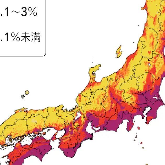 This map shows the government’s assessment of the possibility of a major earthquake (lower 6 on the JMA shindo scale) in the next 30 years.